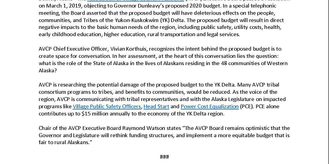 Mar122019Press Release Post navigationPreviousPrevious post:AVCP Encourages TANF Clients To Apply For US Census PositionsNextNext post:Press Release: AVCP Congratulates Pete Kaiser, 2019 Iditarod WinnerRelated PostsAVCP CEO Vivian Korthuis Hosts Unified Media Briefing on Typhoon Halong ResponseStatement from the CEO of AVCP on Federal Disaster Declaration for Typhoon HalongAVCP Urges President Trump to Declare National Emergency for Western AlaskaAVCP Urges Statewide Disaster Declaration Following Typhoon HalongStatement from the CEO of AVCP on Typhoon Halong’s Impact on the Y-K Delta RegionAVCP Reaffirms Commitment to Protect Salmon, Subsistence, and Our Way of Life