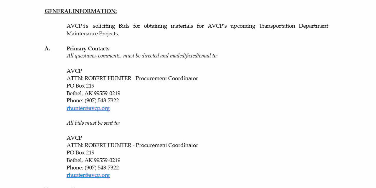 May62019RFP/RFQ2019 RFMB-ACVP-Maintenance-Project-AVCP_Final_5.3.19 Post navigationPreviousPrevious post:Thank you Congressman YoungNextNext post:Letter in support of the VPSO working groupRelated PostsRequest for Quotes-Level AVCP Tugkar Building to Start October 2025ADDENDUM #3-RE-ADVERTISE REQUEST FOR PROPOSAL (RFP) AVCP EED – Multi-Use Facilities Construction and Building Material-Quinhagak, AlaskaADDENDUM #3-RE-ADVERTISE REQUEST FOR PROPOSAL (RFP) AVCP EED – Multi-Use Facilities Construction and Building Material-Russian Mission, AlaskaREQUEST FOR PROPOSAL (RFP) AVCP EED – Multi-Use Facilities Construction and Building Material-Russian Mission, AlaskaREQUEST FOR PROPOSAL (RFP) AVCP EED – Multi-Use Facilities Construction and Building Material-Quinhagak, AlaskaAddendum 1 Request for Material Bid, Published: 01/16/2025_AVCP HIP Department Two House Package HPB KSM – RFMB