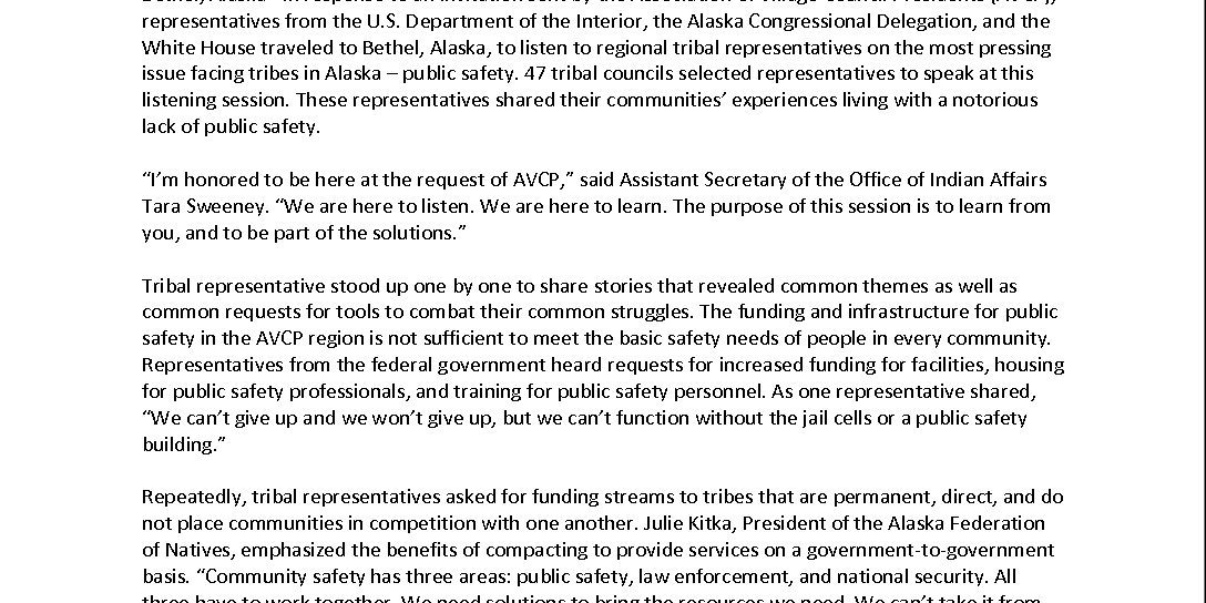 Aug222019Press ReleaseRead the full press release HERE Post navigationPreviousPrevious post:Researching Public Safety in AlaskaNextNext post:Trump Administration Supports American Indian and Alaska Native Communities to End Violence and Illicit Drug ActivityRelated PostsAVCP CEO Vivian Korthuis Hosts Unified Media Briefing on Typhoon Halong ResponseStatement from the CEO of AVCP on Federal Disaster Declaration for Typhoon HalongAVCP Urges President Trump to Declare National Emergency for Western AlaskaAVCP Urges Statewide Disaster Declaration Following Typhoon HalongStatement from the CEO of AVCP on Typhoon Halong’s Impact on the Y-K Delta RegionAVCP Reaffirms Commitment to Protect Salmon, Subsistence, and Our Way of Life