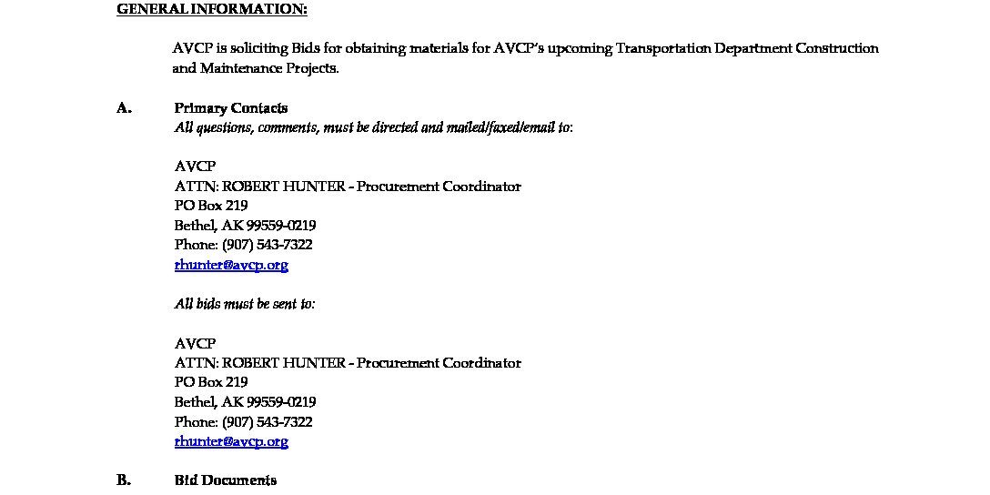 Feb252020RFP/RFQ AVCP 2020 Material Solicitation_cdw(002) Post navigationPreviousPrevious post:Addendum# 2 for Nunaum Iqua, Eek Alaska, Napakiak Alaska Barging and MaterialNextNext post:REAL ID – Letter to Tribal StaffRelated PostsRequest for Quotes-Level AVCP Tugkar Building to Start October 2025ADDENDUM #3-RE-ADVERTISE REQUEST FOR PROPOSAL (RFP) AVCP EED – Multi-Use Facilities Construction and Building Material-Quinhagak, AlaskaADDENDUM #3-RE-ADVERTISE REQUEST FOR PROPOSAL (RFP) AVCP EED – Multi-Use Facilities Construction and Building Material-Russian Mission, AlaskaREQUEST FOR PROPOSAL (RFP) AVCP EED – Multi-Use Facilities Construction and Building Material-Russian Mission, AlaskaREQUEST FOR PROPOSAL (RFP) AVCP EED – Multi-Use Facilities Construction and Building Material-Quinhagak, AlaskaAddendum 1 Request for Material Bid, Published: 01/16/2025_AVCP HIP Department Two House Package HPB KSM – RFMB