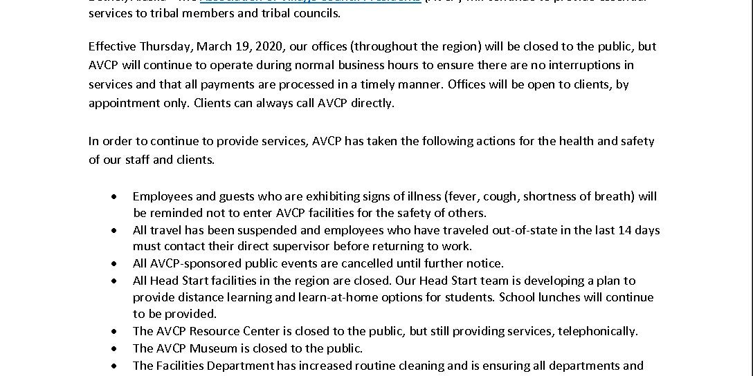 Mar192020NewsPress Release View full press release here. Post navigationPreviousPrevious post:COVID-19 UpdateNextNext post:Emergency Order – Extension of Moose Hunting for Unit 18 RemainderRelated PostsAVCP CEO Vivian Korthuis Hosts Unified Media Briefing on Typhoon Halong ResponseStatement from the CEO of AVCP on Federal Disaster Declaration for Typhoon HalongAVCP Urges President Trump to Declare National Emergency for Western AlaskaAVCP Urges Statewide Disaster Declaration Following Typhoon HalongStatement from the CEO of AVCP on Typhoon Halong’s Impact on the Y-K Delta RegionAVCP Reaffirms Commitment to Protect Salmon, Subsistence, and Our Way of Life