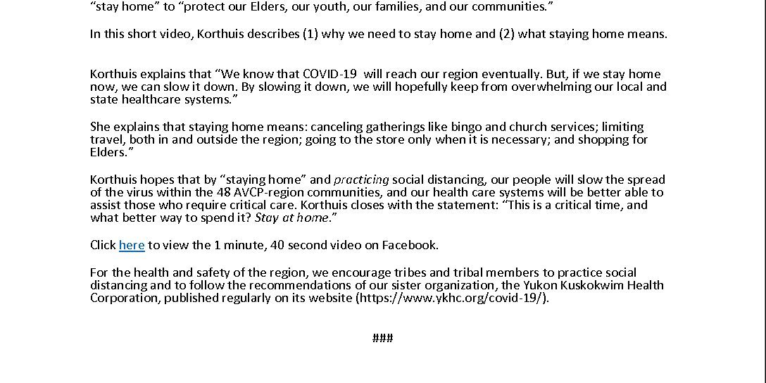 Apr62020Press ReleaseClick HERE to view the full press release. Post navigationPreviousPrevious post:2020 Subsistence Migratory Bird Hunt Regulation BookletNextNext post:Group Letter to Bethel RetailersRelated PostsAVCP CEO Vivian Korthuis Hosts Unified Media Briefing on Typhoon Halong ResponseStatement from the CEO of AVCP on Federal Disaster Declaration for Typhoon HalongAVCP Urges President Trump to Declare National Emergency for Western AlaskaAVCP Urges Statewide Disaster Declaration Following Typhoon HalongStatement from the CEO of AVCP on Typhoon Halong’s Impact on the Y-K Delta RegionAVCP Reaffirms Commitment to Protect Salmon, Subsistence, and Our Way of Life