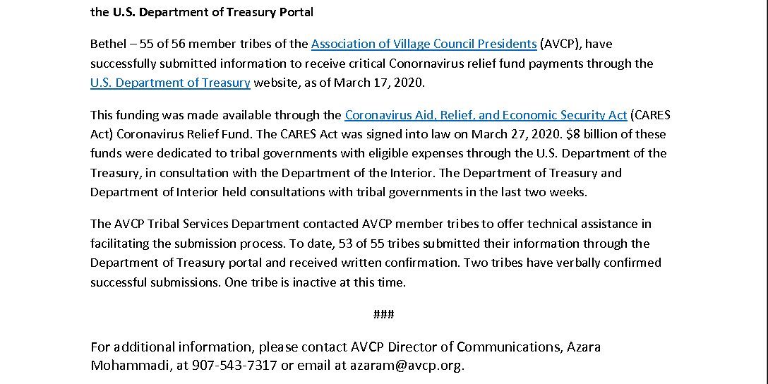 Apr172020Press ReleaseClick HERE to view or download the press release. Post navigationPreviousPrevious post:College Scholarship Deadlines: Summer & FallNextNext post:Press Release: AVCP Mourns the Passing AVCP Traditional Chief, Peter MooreRelated PostsAVCP CEO Vivian Korthuis Hosts Unified Media Briefing on Typhoon Halong ResponseStatement from the CEO of AVCP on Federal Disaster Declaration for Typhoon HalongAVCP Urges President Trump to Declare National Emergency for Western AlaskaAVCP Urges Statewide Disaster Declaration Following Typhoon HalongStatement from the CEO of AVCP on Typhoon Halong’s Impact on the Y-K Delta RegionAVCP Reaffirms Commitment to Protect Salmon, Subsistence, and Our Way of Life