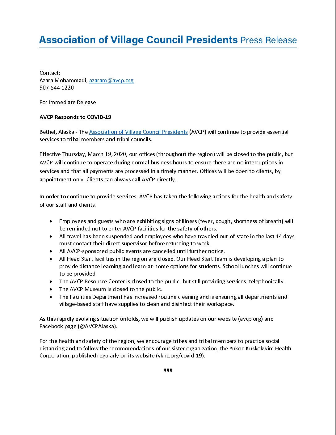Press Release: AVCP Encourages Everyone to “Stay Home” through Video PSA
