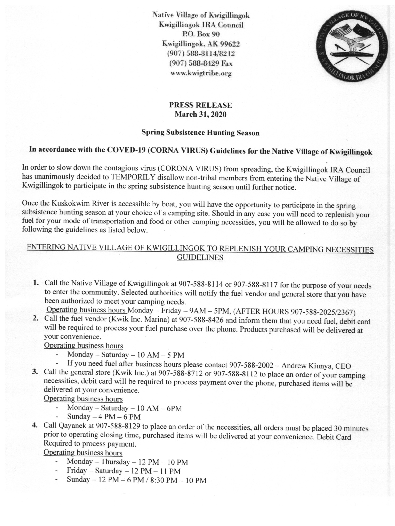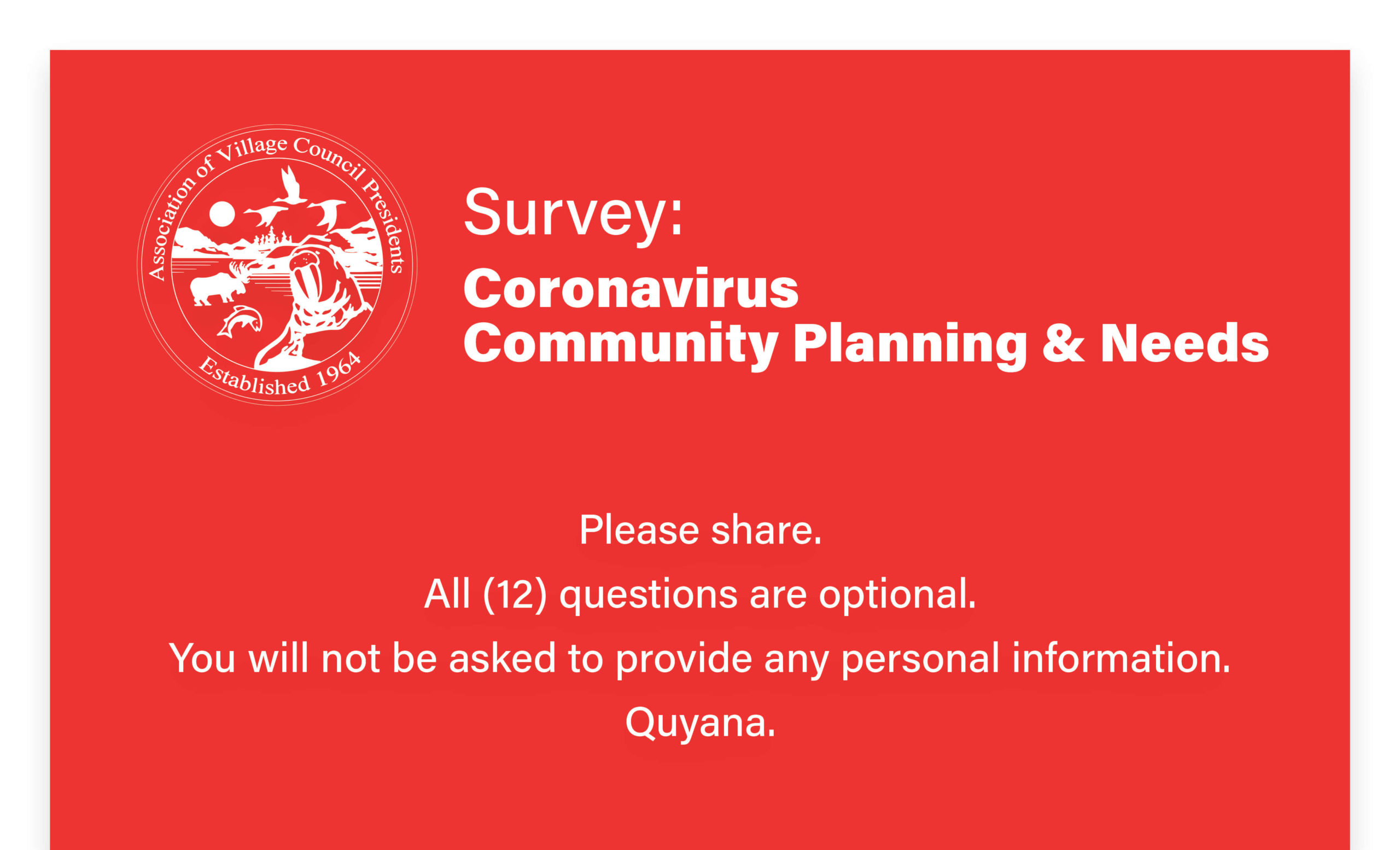DetailsPlease help us understand the needs and precautions taken in your community, in light of the coronavirus (COVID-19). Start the survey by clicking HERE. Quyana for sharing.