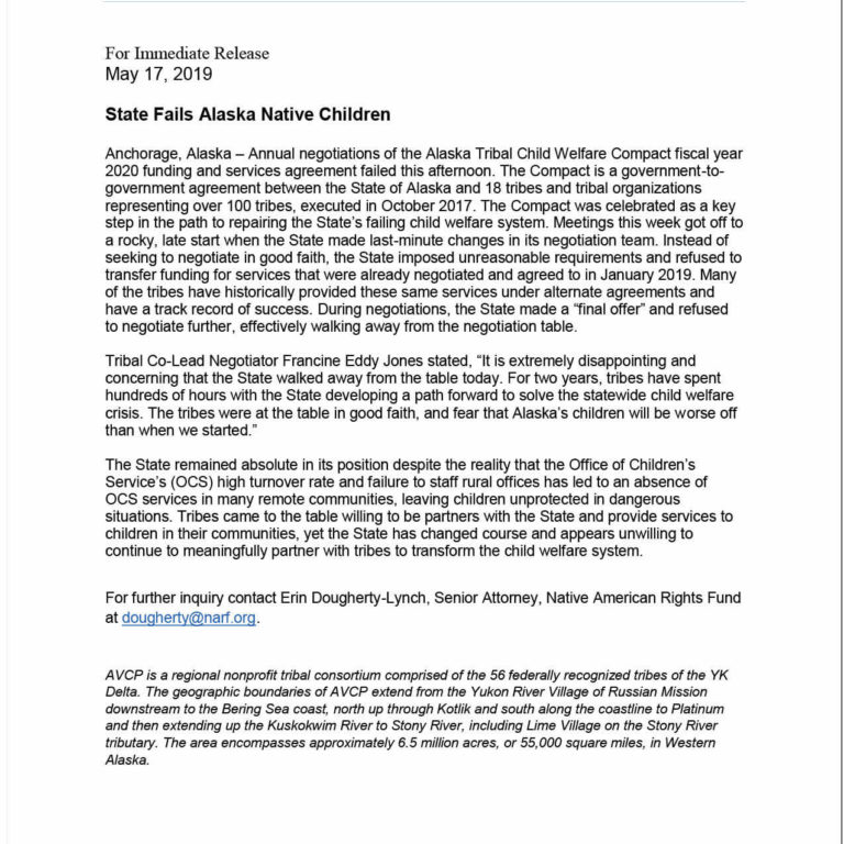 Joint Press Release from National Native Organizations on the Overwhelming Support for the Indian Child Welfare Act News, Press ReleaseBy avcpadm See the full press release: 2019 01 17 Tribal Amicus Press Release Details