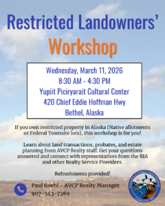 On March 11, join us for AVCP’s Restricted Landowners’ Workshop at the Yupiit Piciryarait Cultural Center in Bethel. AVCP Realty Staff, representatives from BIA & other Realty Service Providers will be present. If you or a family member own restricted property, don’t miss this opportunity! We’ll also have refreshments ![]()